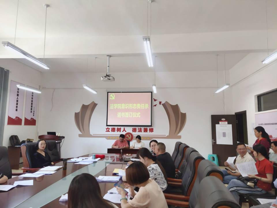 会上,举行了法学院意识形态责任承诺书签订仪式,领导干部代表詹伟、专任教师代表何鹏、管理岗教师代表杨兴莉分别在仪式上签订了意识形态责任承诺书。