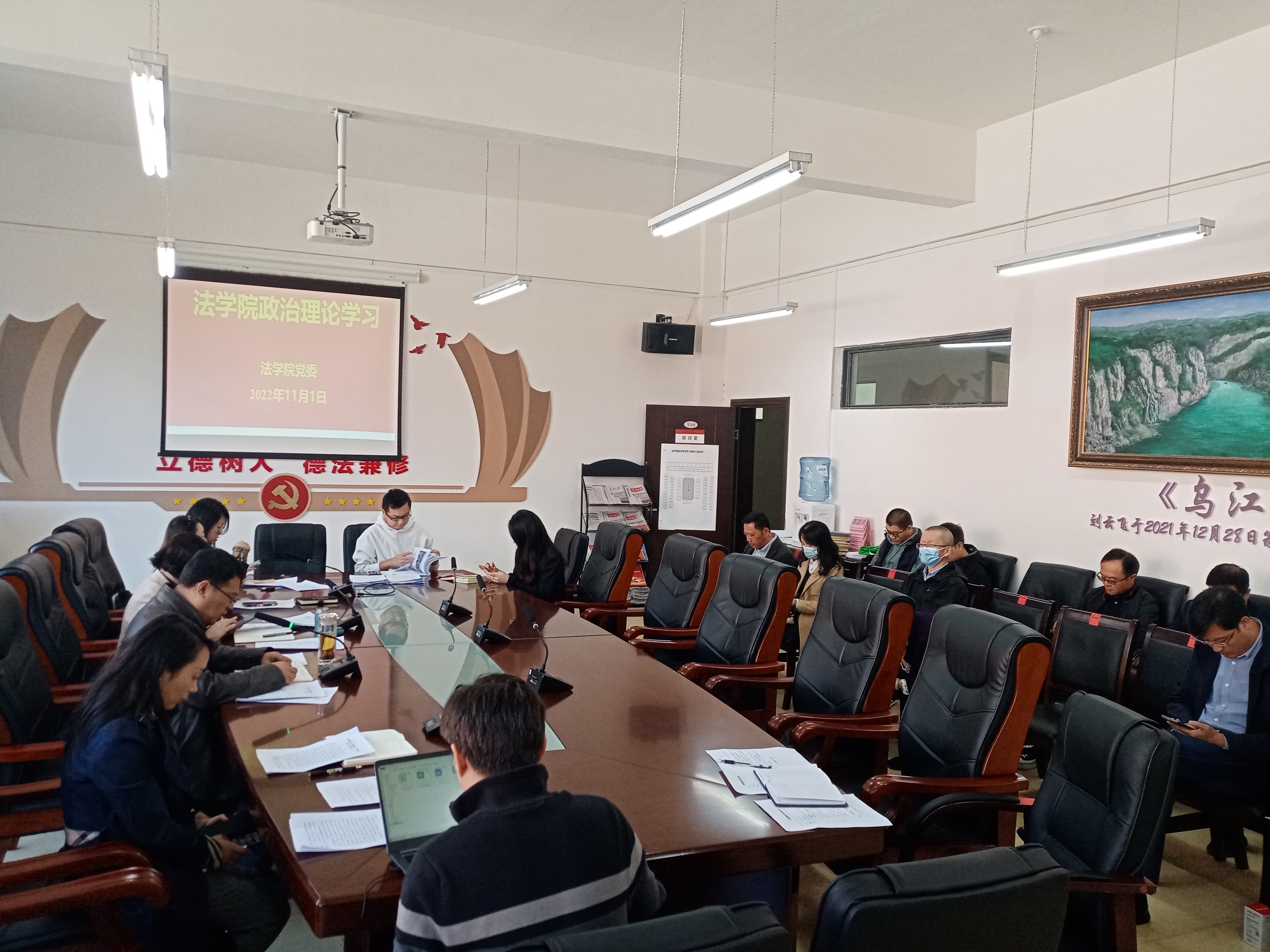 2022年11月1日下午,法学院党委围绕“党的二十大精神”专题组织召开2022年度第十三次教职工政治理论集体学习研讨会议。院领导及全院教职工出席会议,院党委书记詹伟主持会议。