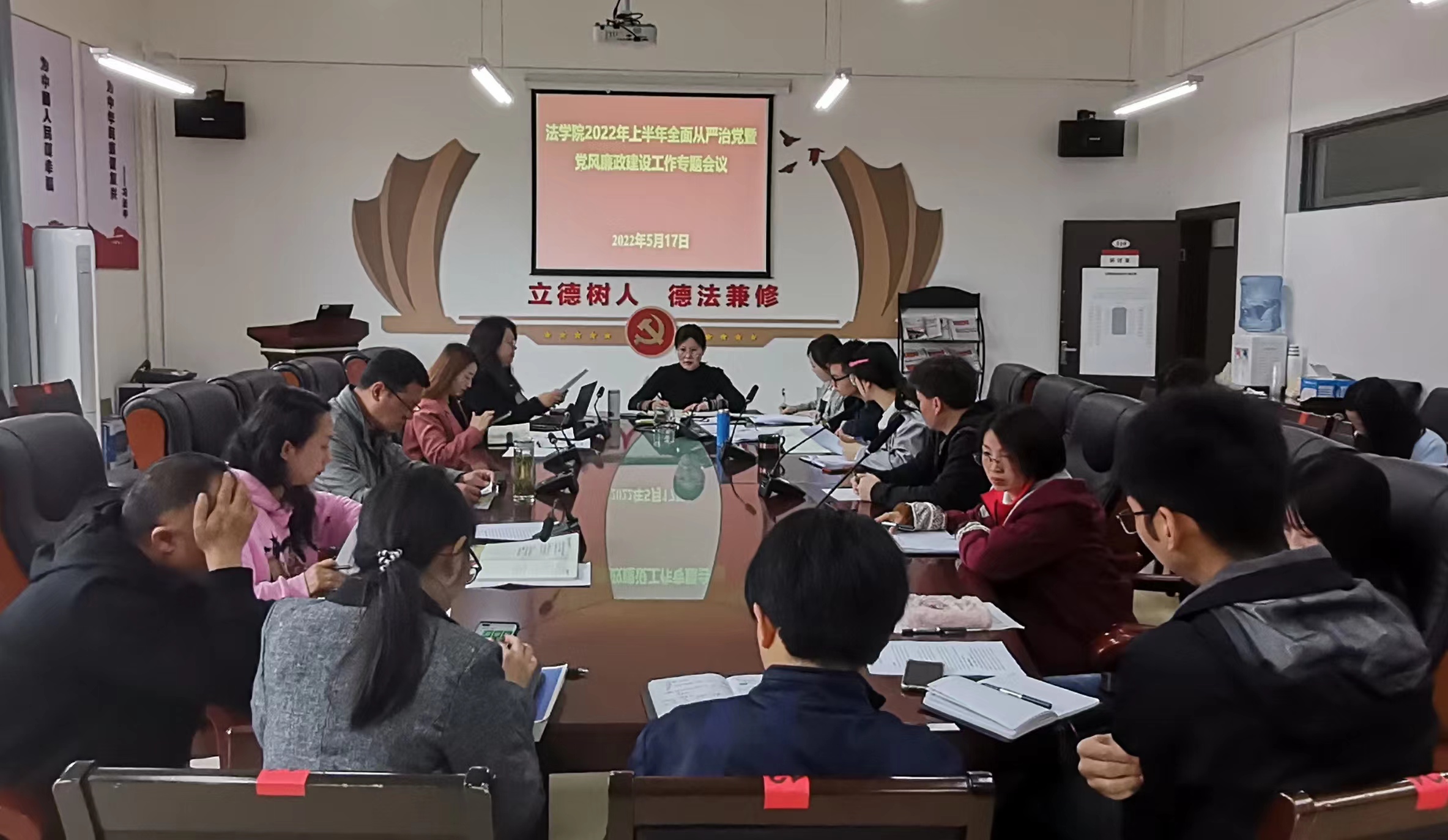 (法学院 图文/报道 徐方)2022年5月17日下午,法学院党委在文德楼A8-310会议室召开2022年全面从严治党暨党风廉政建设工作会。学院领导、各科室负责人、系负责人、支部书记等全体行政人员参加会议。会议由学院党委书记詹伟主持会议。