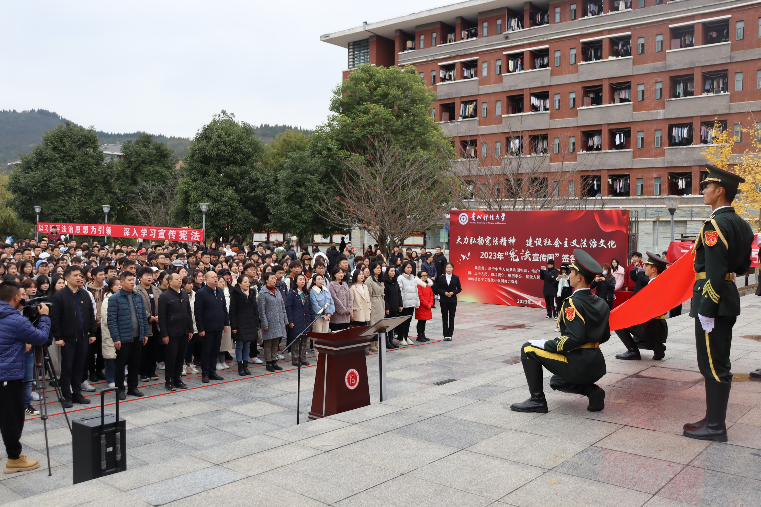 宪法是国家的根本法,是治国安邦的总章程,是全面依法治国的总依据。活动有四项进程:一是出国旗、奏唱国歌;二是校党委委员、副校长李汉文讲话,他强调要加强专业人才培养和队伍建设;要坚定法治自信,讲好新时代中国法治故事;要从内心拥护和真诚信仰宪法,做社会主义法治的忠实崇尚者、自觉遵守者、坚定捍卫者。三是李汉文带领全体师生进行宪法宣誓,忠于中华人民共和国宪法,维护宪法权威,履行法定职责,忠于祖国、忠于人民,恪尽职守、廉洁奉公,接受人民监督,为建设富强民主文明和谐美丽的社会主义现代化强国努力奋斗;四是全体师生移步宪法宣誓签名墙签名。