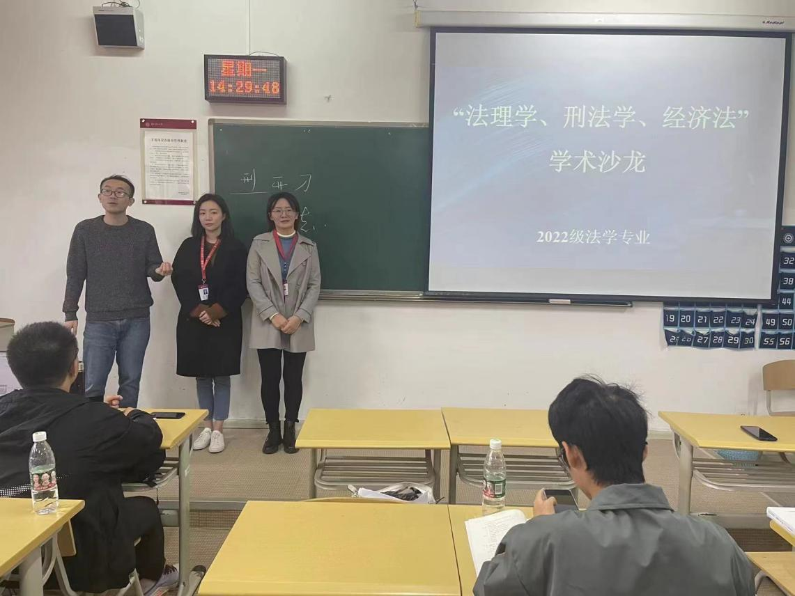 2022年11月14日下午,法学院青年教师钟一苇博士、许丹琳博士、陆敏博士在勤学楼4-17教室为2022级法学类1班新生开展了主题为“法理学、经济法学与刑法学”的讲座沙龙。自2019年以来,三位教师坚持为法学院每一届新生举办一次学术沙龙。