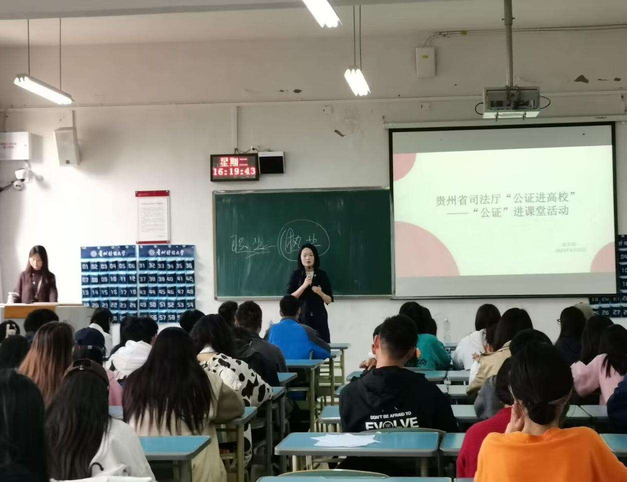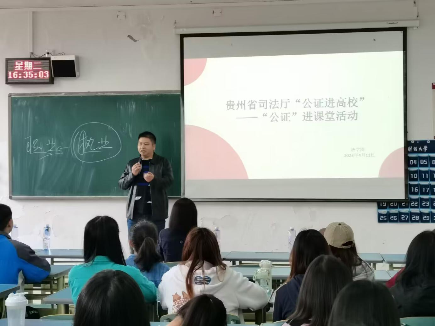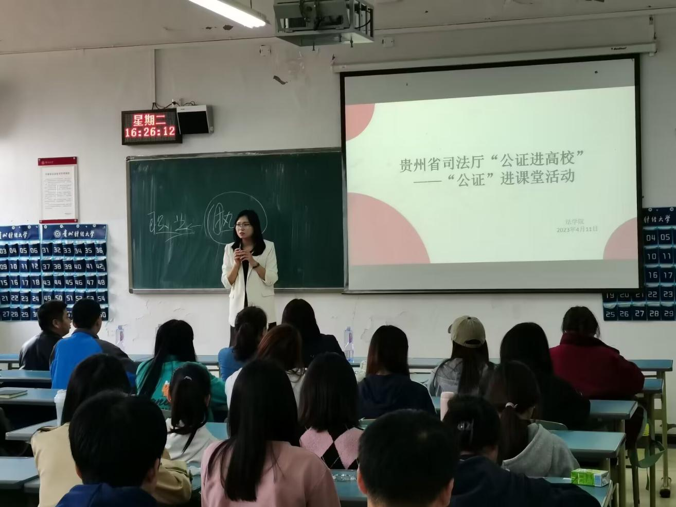 (法学院 图文/报道 张显薇)2023年4月11日下午两点,安博安博首页_安博(中国)_安博(中国)120名学生在博学楼2-19教室参加了贵州省司法厅“公证进高校”活动。贵州省司法厅公共法律服务管理处三级调研员申状平,贵阳市公证协会第三届理事会副会长兼秘书长龚燕婕,凤冈县公证处执业公证员、我院2013级法学专业优秀校友王克桃参与此次活动,法学院党委副书记、院长陈玉梅主持。