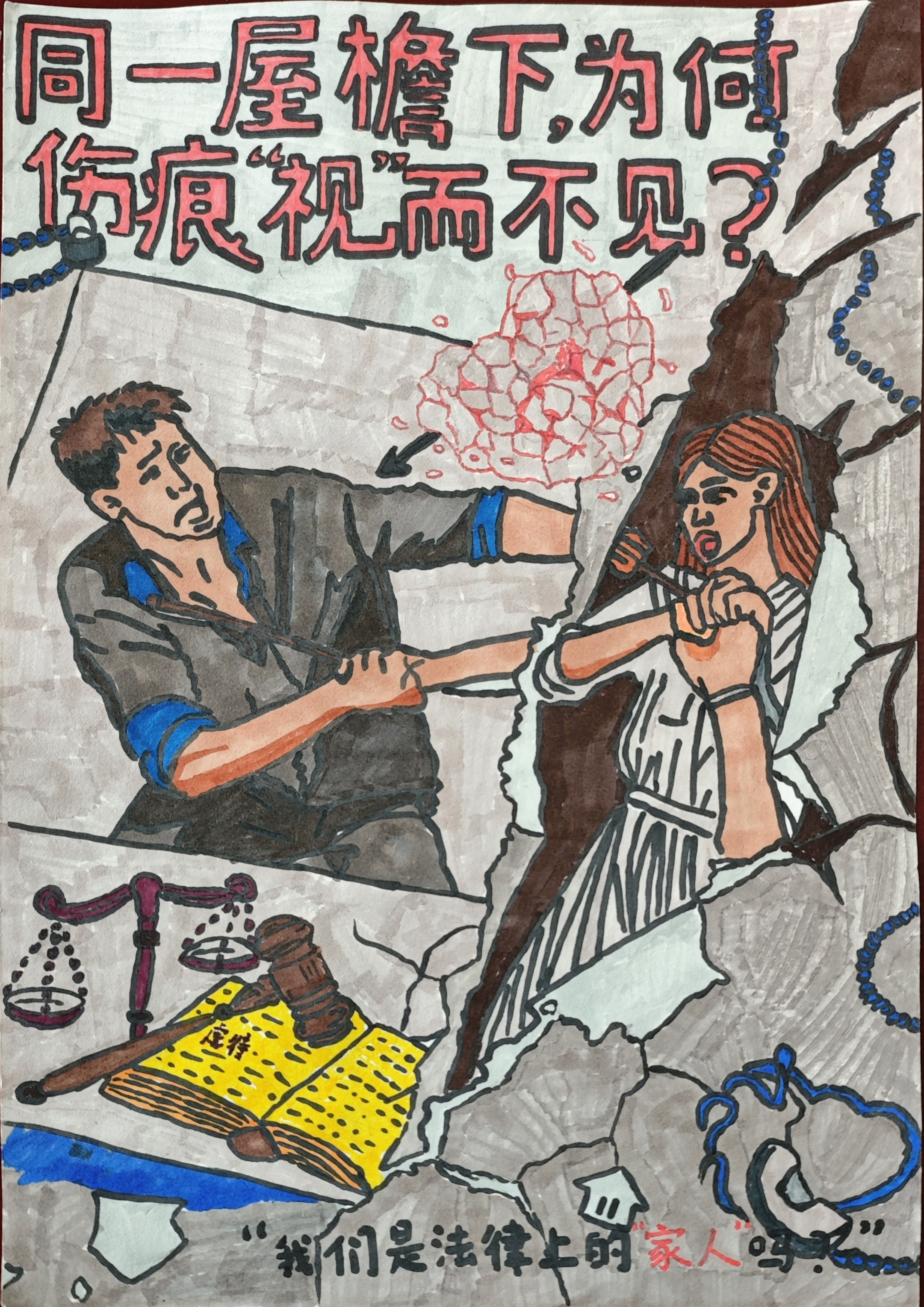 《同一屋檐下,为何伤痕 “视” 而不见?》以黑白漫画的强烈对比张力,聚焦家庭暴力防治主题,通过极具冲击力的视觉隐喻,直指 “家暴隐蔽性” 与 “旁观者漠视” 的社会痛点,既契合反家暴法的普法内核,又以漫画的直白笔触唤醒公众对家庭弱势群体的关注,让 “法律守护家庭安宁” 的理念在视觉冲击中深入人心。