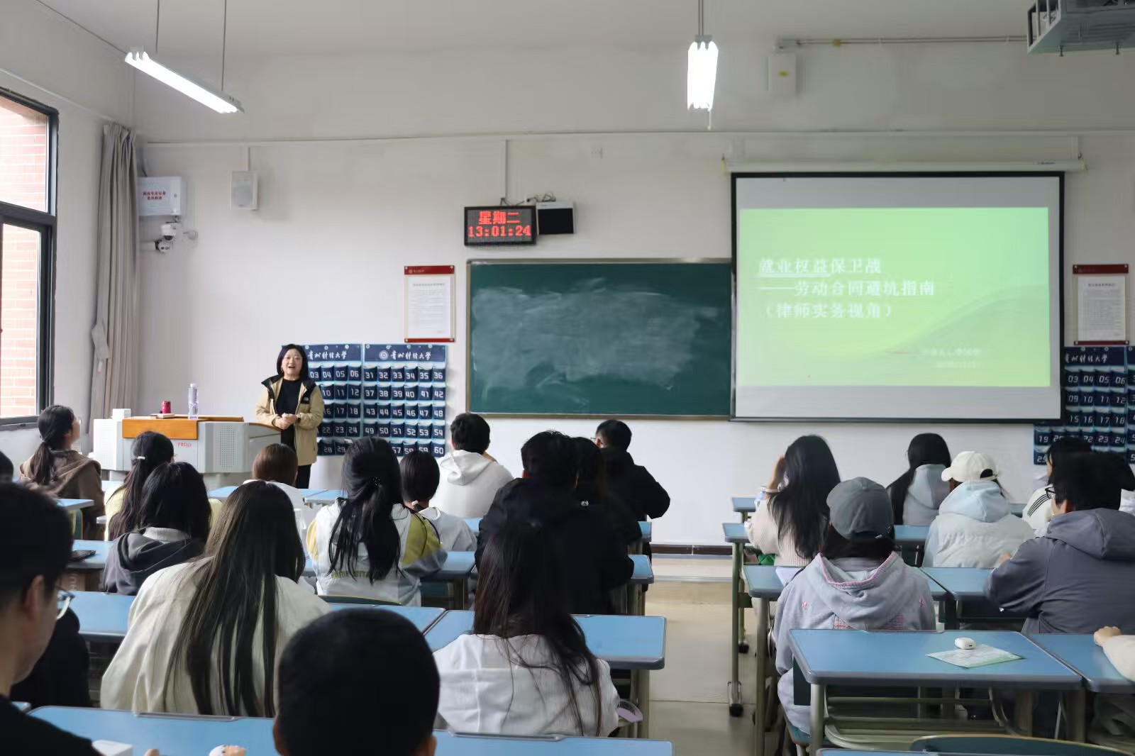 (法学院 新媒体部 图文报道)为切实提升高校毕业生就业权益保护能力,响应国家促进高校毕业生就业创业的政策号召,10月21日,2025“就业引航”高校毕业生留筑服务站在博学楼2-17开展“就业权益保卫战:劳动合同避坑指南”专题培训。本次培训由贵阳市委人才办、共青团贵阳市委、贵州财经大学校团委主办,法学院承办。培训由拥有14年执业经验的李垣莹律师担任主讲人,法学院100余位同学参加。