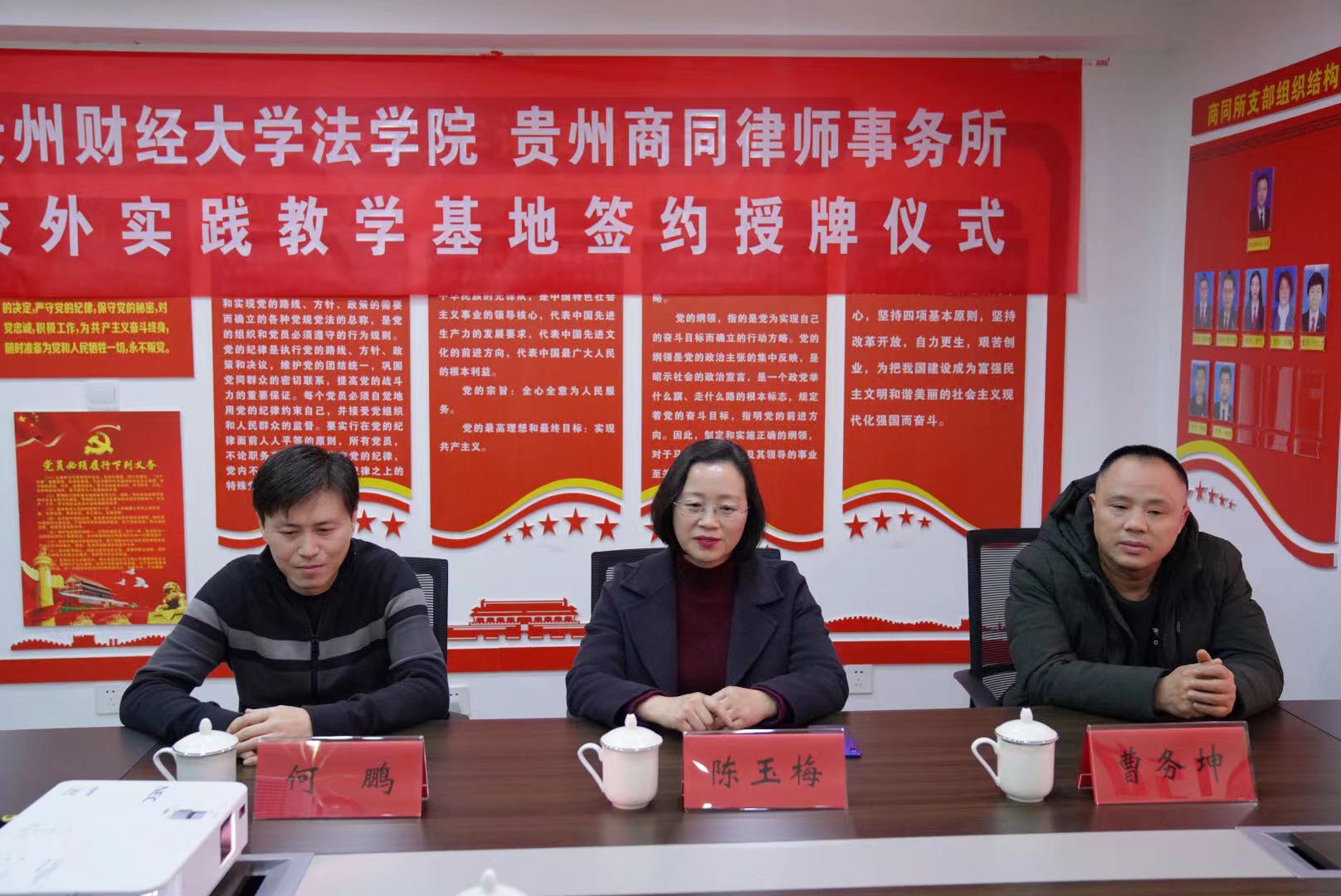2021年4月8日,安博安博首页_安博(中国)_安博(中国)与贵州商同律师事务所校外实践教学基地签约暨授牌仪式在观山湖区贵州商同律师事务所举行,安博安博首页_安博(中国)_安博(中国)副院长陈玉梅教授、院长助理曹务坤教授、何鹏博士,贵州商同律师事务所在所的高级合伙人冉政林、王军、邓世军、陈佳、石磊参加签约既授牌仪式,并举行了座谈。