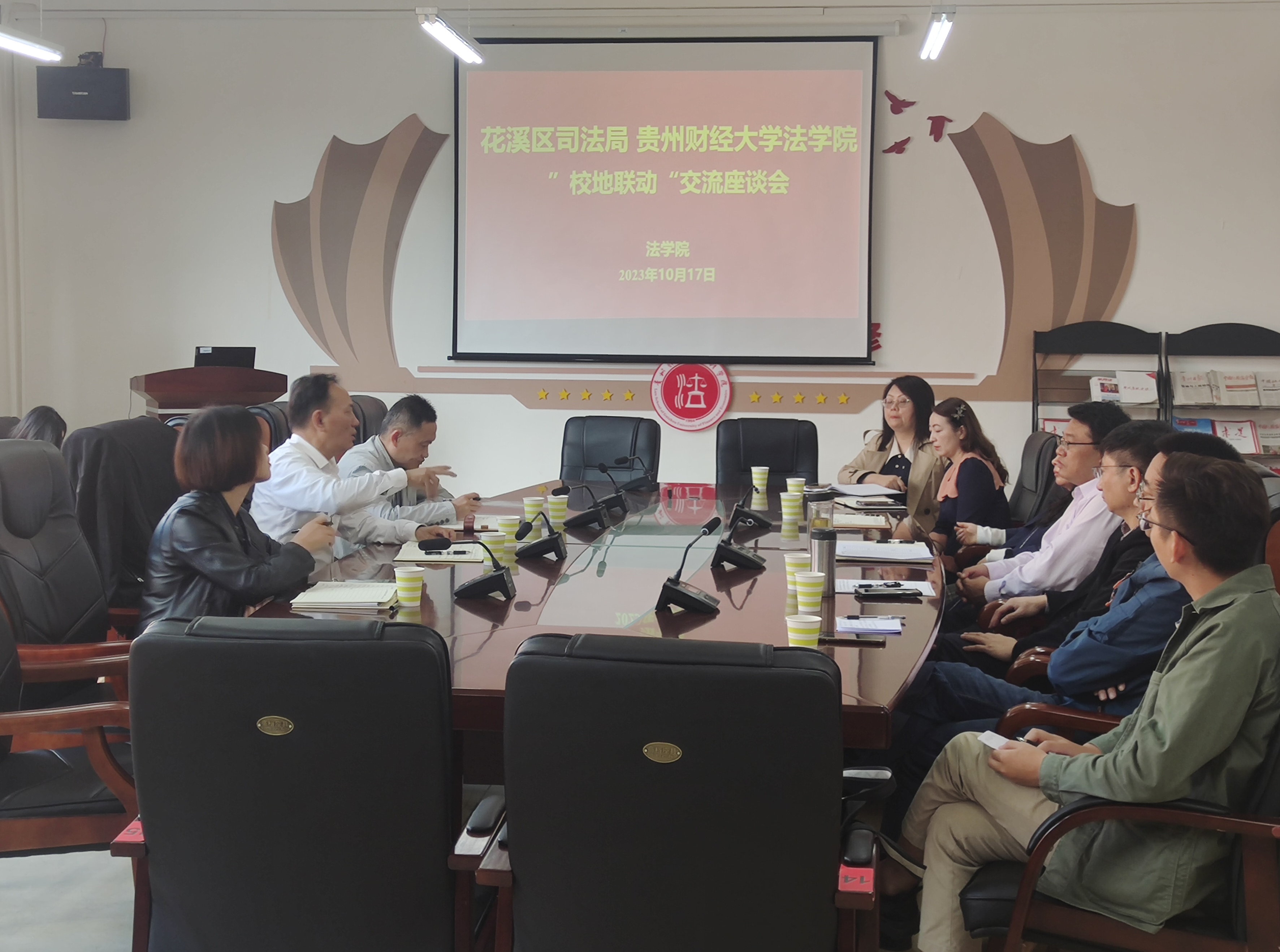 (法学院 报道/摄影 王宏)10月17日下午,花溪区司法局党组书记、局长田景文等一行与安博安博首页_安博(中国)_安博(中国)法学院举行 “校地联动”交流座谈会,法学院党委书记詹伟主持会议。