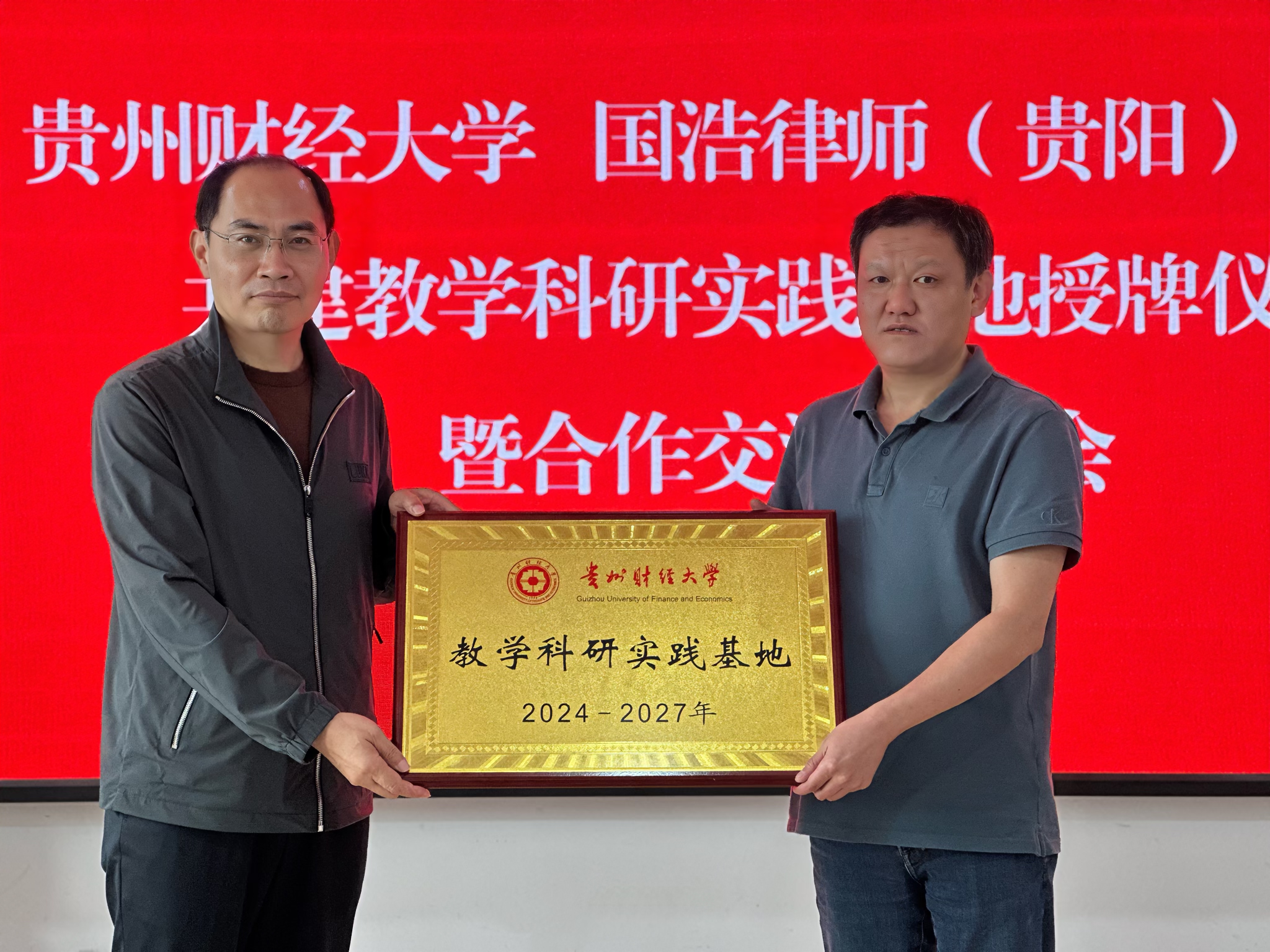 (法学院 王霖 图文/报道)2024年6月8日下午,贵州财经大学特聘教授、贵州省社会科学院原党委书记吴大华;安博安博首页_安博(中国)_安博(中国)党委书记邵新顺,党委副书记、院长陈玉梅一行前往国浩律师(贵阳)事务所(以下简称为“国浩贵阳律所”),举行共建教学科研实践基地授牌仪式暨合作交流座谈会。贵州省律师协会会长、国浩贵阳律所合伙人白敏;国浩贵阳律所主任、管理合伙人郑世红,党支部书记、管理合伙人兰钢等人员出席会议。会议由国浩贵阳律所管理合伙人潘志成主持。双方就党建工作开展、法商融合型人才培养、科研合作创新、实践成果转换等问题进行了深入交流。
