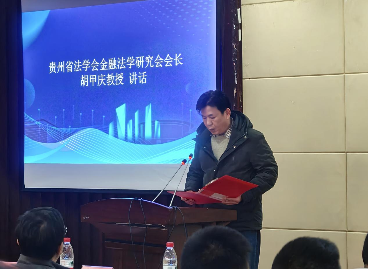 贵州省法学会金融法学研究会会长胡甲庆讲话,他指出,我国在金融法治与乡村治理法治建设方面取得系统性进展。他重点阐述了金融基础设施法治化、现代央行制度完善、数字人民币立法、“耐心资本”引导、金融“五篇大文章”法治保障等方面的成就,并强调乡村治理在法治保障、数字赋能、土地制度创新、生态环境共治等方面取得的突破。展望2026年,他表示研究会将围绕中央与省委部署,深化金融法治与乡村治理法治研究,助力中国式现代化进程。