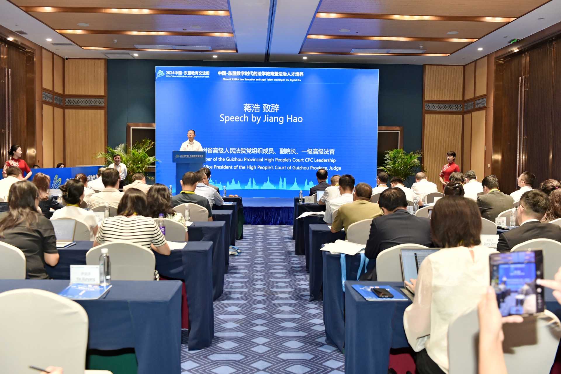 贵州省高级人民法院党组成员、副院长、一级高级法官蒋浩在致辞中强调,本次论坛探索中国和东盟国家数字时代法学教育数字化转型,助推数字时代法学教育理念和模式重塑,开辟数字时代法治人才培养新路径,必将对中国东盟一带一路沿线国家深化数字时代法学教育领域合作,促进法治事业发展具有重大意义。他还提出法学教育应紧跟时代,积极应变求变;携手奋进,共育法治英才;注重实训,弥合实践鸿沟;面向世界,培育复合型人才等四点建议。