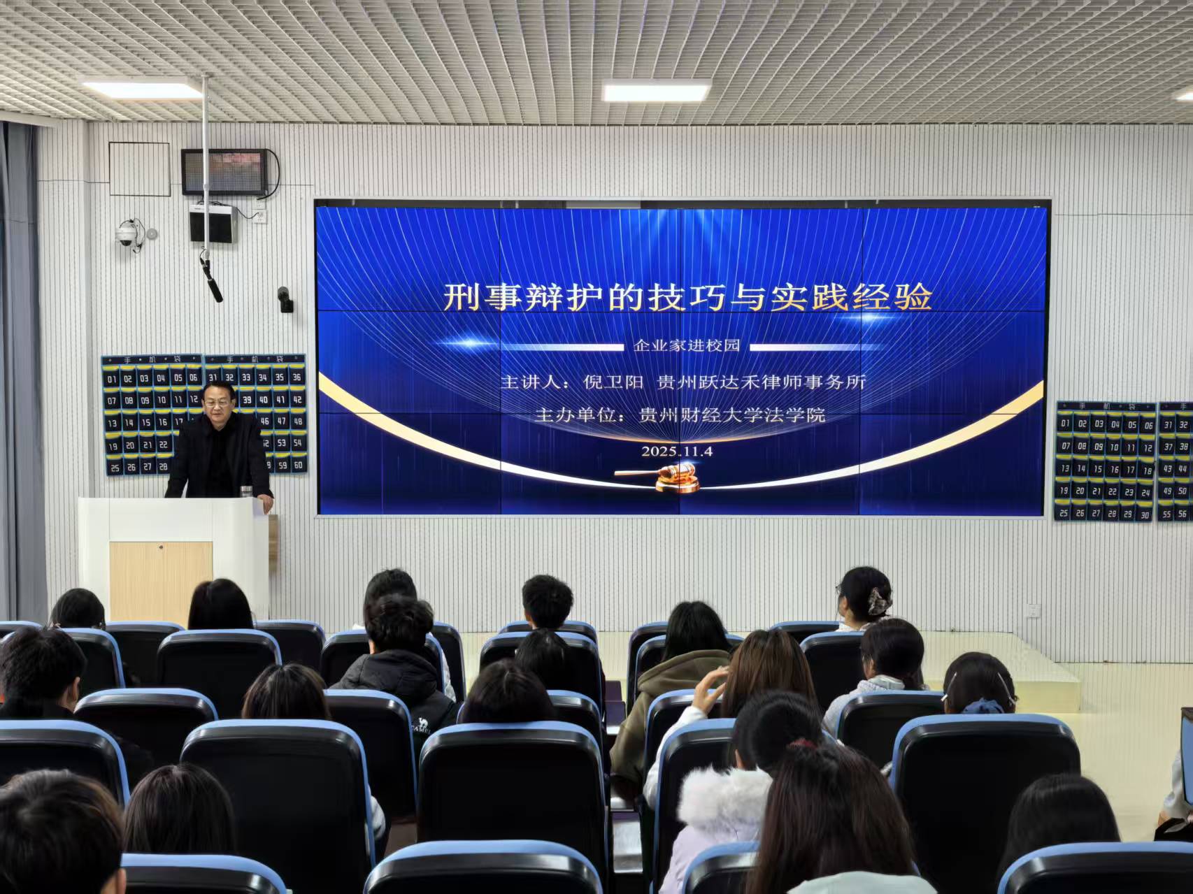 (法学院 何德爽 报道|摄影 李嘉琪)11月4日,由安博安博首页_安博(中国)_安博(中国)主办的文化传承与创新之“企业家进校园”活动在进学楼103教室顺利举行。本次讲座邀请贵州省优秀律师、贵州跃达禾律师事务所副主任倪卫阳为主讲人,为全校师生带来一场“刑事辩护的技巧与实践经验”的专题讲座。讲座由法律事务俱乐部主席何德爽主持,全校120余名同学参加。